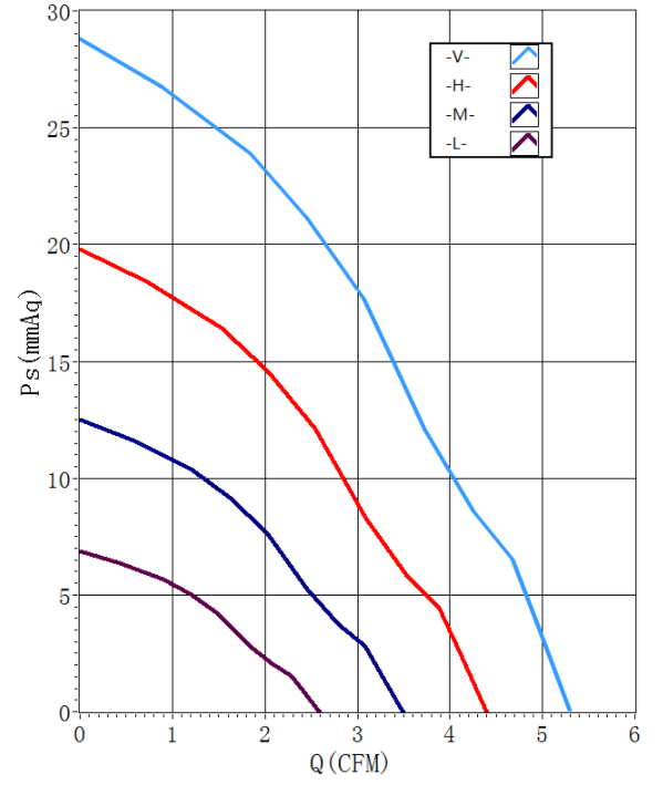 Part NO: | VDC | A | W | RPM | CFM | m3/min | mmAq | InH2O | dBA |