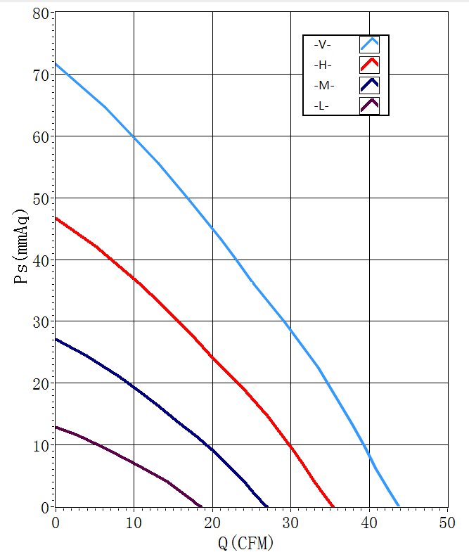 Part NO: | VDC | A | W | RPM | CFM | m3/h | mmAq | InH2O | dBA |